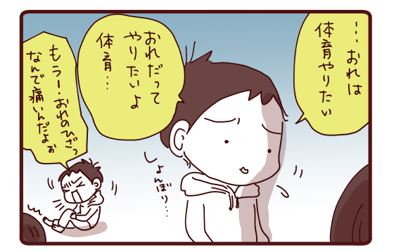 洋も最初のうちは、『体育見学、楽できてラッキー♪』って思ってたみたいなんですが、それがずーっとだと、やっぱり『早くみんなと一緒にやりたい』っていう気持ちの方が勝ったようです。