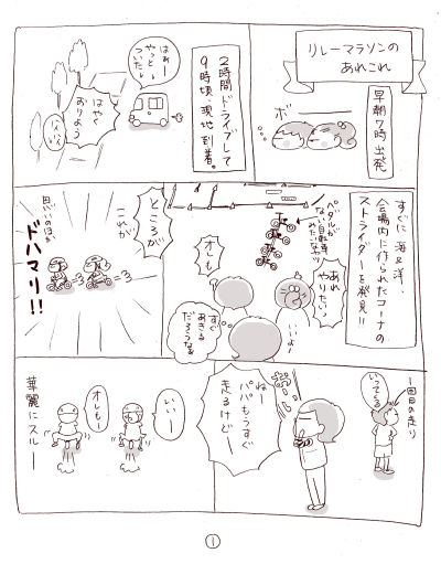 リレーマラソンのあれこれ【漫画】 2014年11月17日 先日、ダンナの会社が参加するリレーマラソンに家族でいってきました。42.195キロを1・5ずつリレーして走るというもの。ひとり何回走ってもいいそう。ダンナは2回走ることに。海&洋は前日から、「パパ、おうえんするからね!がんばってね!」と応援する気満々!さて ... 続きを読む