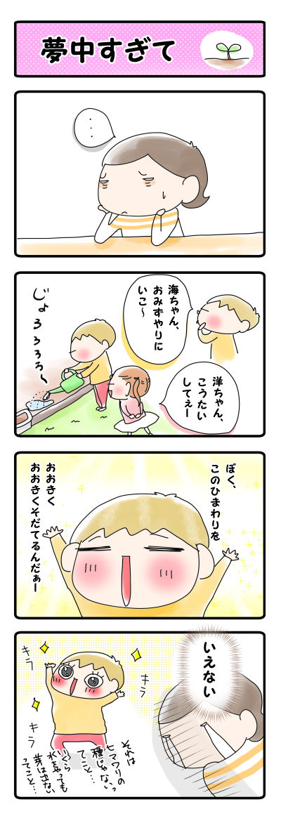 夢中すぎて【4コマ】 2015年01月29日 幼稚園の園庭で拾ったんですって。種みたいだけど、どうみても芽は出てきそうにないなにやら種っぽいもの…?!でも、うれしそうに持ち帰ってきて、いそいそとお庭に穴を掘って埋め、毎日、お水をかけて「め、でないかな~♡」ってのぞきこんでる姿を見ると、いえないよぉ ... 続きを読む