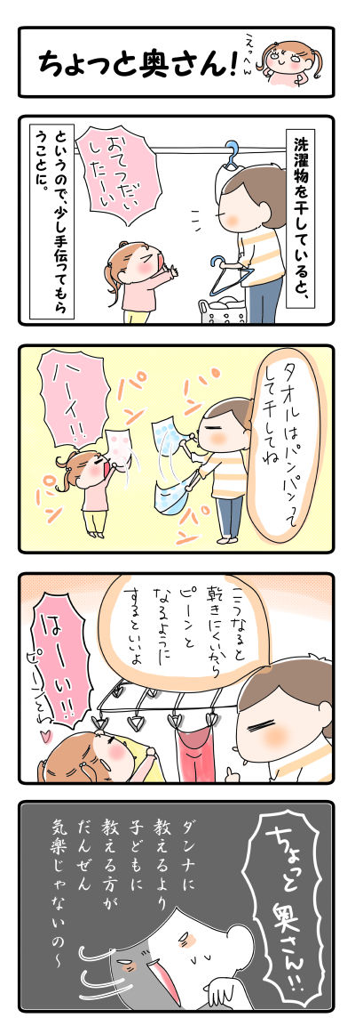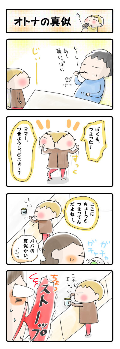 オトナの真似【4コマ】 2015年01月26日 洋は、オトナのやることなすこと、よ~く見てるんです。んでは、本題、どぞー♪ もどすんかいっ!!つまようじ、使い方は見てたけど、その後どうするかまでは見てなかった模様!ソコ、ダイジー使った感あるつまようじを探すのに、母、大変だったんだってばさっ!!マコチッえぇ ... 続きを読む