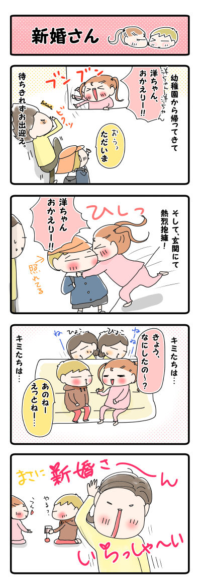 新婚さん【4コマ】+プペッティ! 2015年01月22日 本日は、海が風邪を引いて幼稚園をお休みしていたときのこと。本題どんぞ。 まさに、二人の間に入る隙ナシっ海もたまの一人を満喫しても、やっぱりつまらなかったんでしょうね~。洋が帰ってきたときの歓迎ぶりったら…そりゃ、三枝さんにもなりますって!!ねっねっま、こ ... 続きを読む