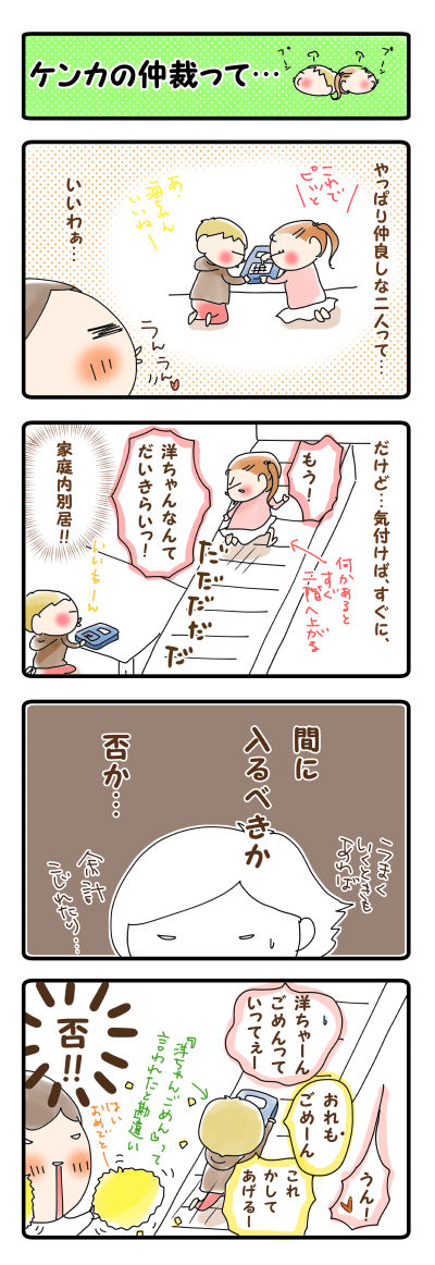 ケンカの仲裁って…【4コマ】 2015年01月23日 前記事で、蜜月状態だったので、いつもこんな?って思われたそこの奥さん!答は、Noです!No!!うちの新婚さん、どちらかといえば、ケンカばっかり!!(笑)でもですね~…てなとこで、本題どぞ~。 ナニコレ、ナニコレ!犬も食わねぇってやつ!?新婚夫婦がケンカして、 ... 続きを読む