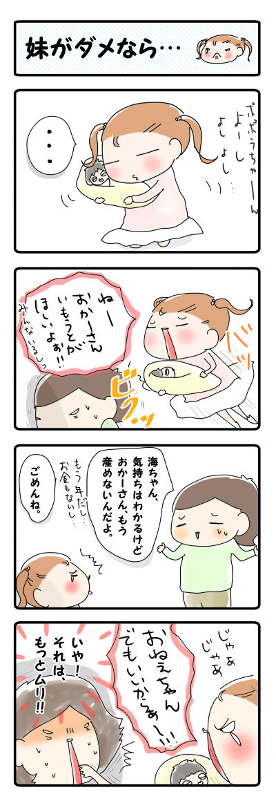 妹がダメなら…【4コマ】+勝手にお祝い♪ 2015年01月25日 どうしても、海はあきらめきれないみたいです(汗)。では、本題どぞ~♡気持ちはチョ~わかるのよぉ~!私も弟一人だったから、母に「おかーさん!おねえちゃん、うんで!!」って頼んだことあるものー あと、10年若かったらねぇ~…でも姉はムリか フンガッ でも、これな ... 続きを読む