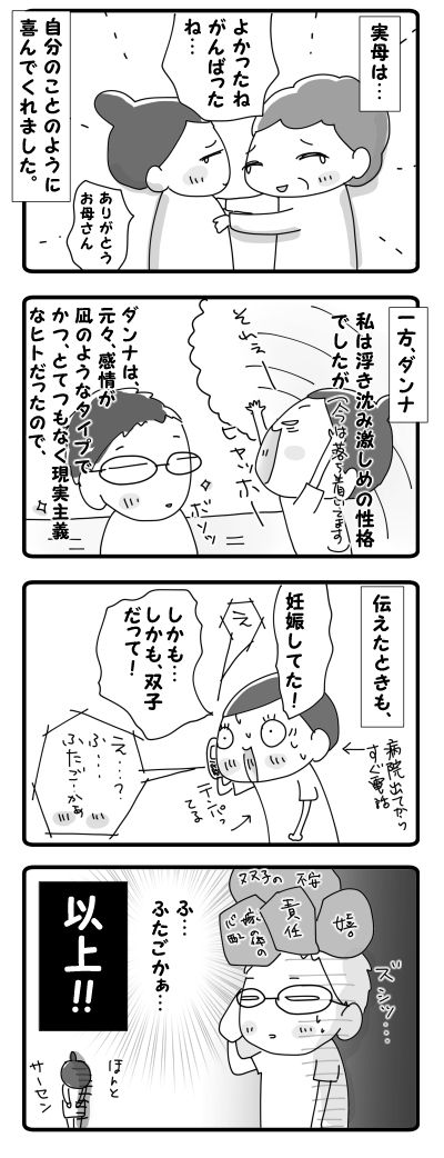 生まれたての双子は…【4コマ】 2015年05月24日 ママブロネタ「日々のできごと」からの投稿海、洋、私とつながっていた胃腸炎も珍しくダンナにはうつることなく、全員、ほぼ回復しました~ご心配おかけしました!と、思ったら、起きてきたダンナ、ピーだったと…よーし、隔離っ!!(笑)○●○●○●○●○● ○●○●○ ... 続きを読む