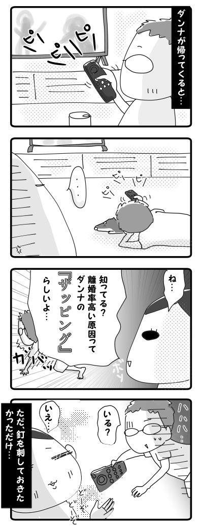 軽やかに追い打ちをかける娘。【4コマ】 2015年06月19日 ママブロネタ「日々のできごと」からの投稿***ちょっとモノ申しておきたかった…***ザッピングテレビ視聴において、リモコンでチャンネルを頻繁に切り替えながら視聴する行為だそうです~。大量の『同じく!!!』コメいただきました!圧倒的に旦那様がザッピング王だという ... 続きを読む