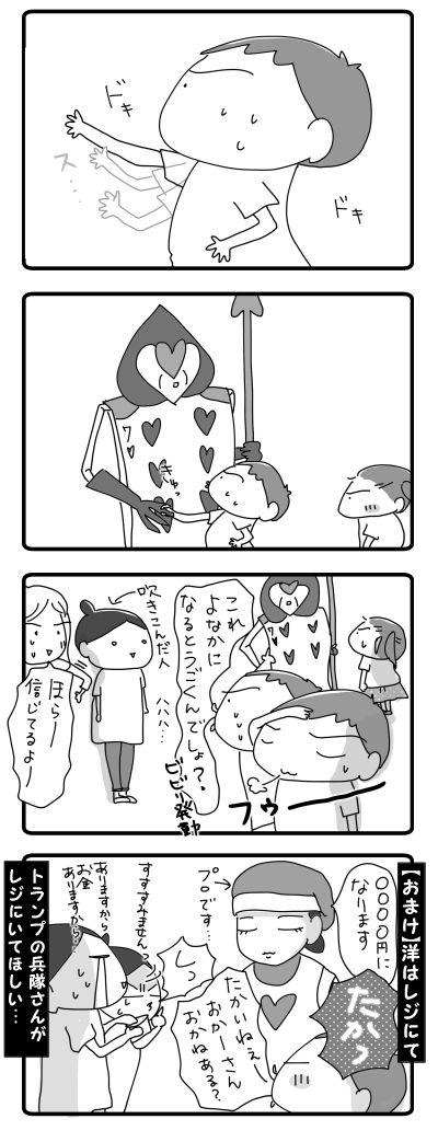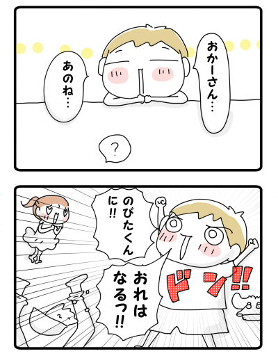 ついにこんなことに…!【2コマ】 2015年06月26日 ママブロネタ「今日のうちの子」からの投稿我が家のドラえもん劇場では、必ず、海がドラえもん、洋がのび太役に。海から、「のびたくん、あそぼうよ!」「のびたくん、おいでぇ~」「のびたくん、しょうがないなぁ~♪」(すべてドラえもんの声マネ)と言い続けられた結果…つ ... 続きを読む