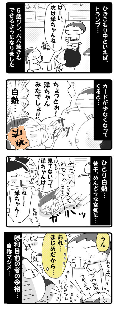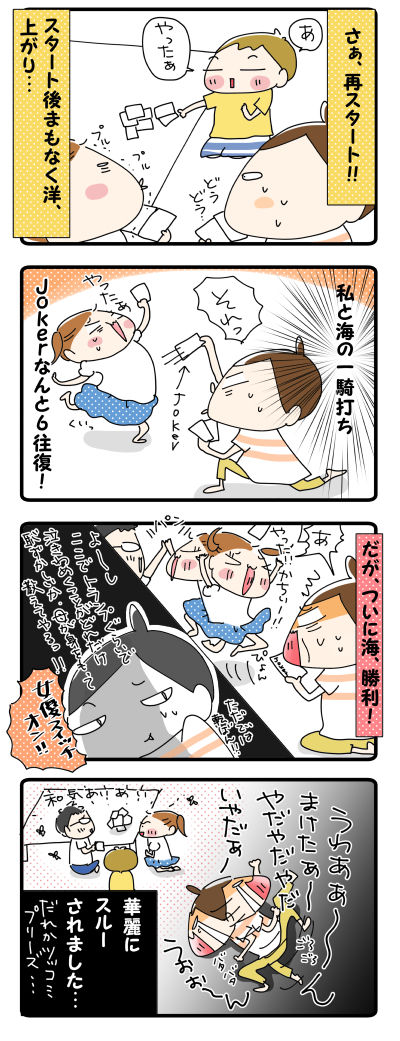 体当たり育児…?!【4コマ】 2015年07月13日 ママブロネタ「日々のできごと」からの投稿前記事より、トランプつづき。洋ののぞき見疑惑をなんとか晴らし、ようやく… たかがゲーム…勝つこともあれば負けることもある!毎回、ギャーギャー泣くことがどんだけ恥ずかしい姿か、見せたるっ!…。誰も見てねぇ…!(くっ) ... 続きを読む