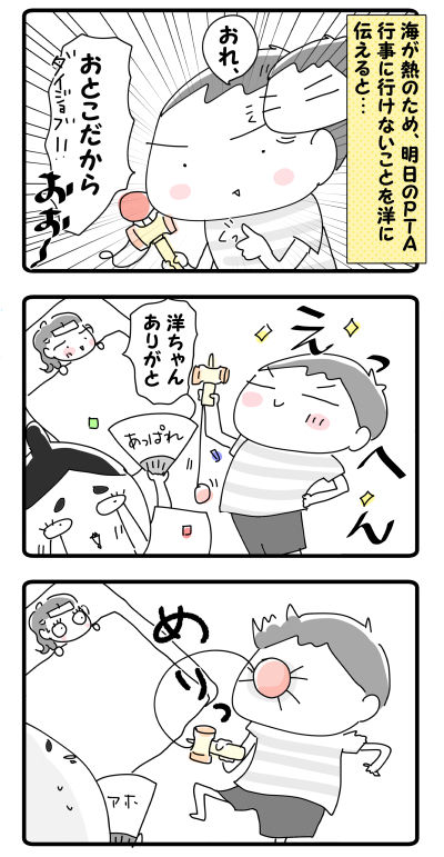 おぉ~!あっぱれ!【3コマ】 2015年07月08日 昨日のお昼過ぎに熱発した海。今日は、1学期最後のPTAでした。 いや、でも、「えぇ~、ひとりはいやだなぁ~…」って言うかと思ったら、「まかせてくれよ」的な…!殿~!ご立派になられて…あっぱれでございますよ~!!って思った瞬間にコレですけども…(笑)海は、ど ... 続きを読む