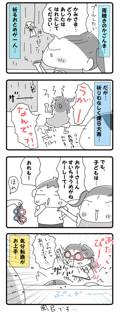 見習いたい【4コマ】 2015年07月06日 ママブロネタ「日々のできごと」からの投稿今年は本当に雨つづき…たまっていく生乾きの洗濯物やカビの成長…そして、ひきこもりでうっぷんもたまる日々(あ、これはいつもか)。。海も楽しみにしていた(洋はそうでもない)幼稚園プールが延び延びになって、ついにてるてる ... 続きを読む