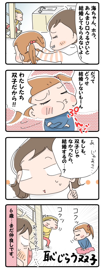 ついに双子に亀裂が…?! 2015年12月07日 ママブロネタ「日々のできごと」からの投稿○●○●○●○●○● ○●○●○●○●○● いつも読んでくださってありがとうございます(・∀・) /本日の4コマは、前記事のkatsukenさんのご質問のアンサーに…なるかな?( ´艸`) ちなみに5歳ジンの頃はこんな感じ♪↓『双子同 ... 続きを読む