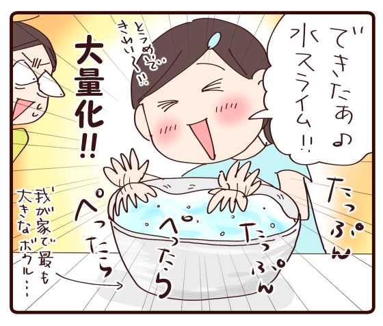 大きなボウルに作った水スライムは、百均で買った別の洗面器にうつしてもらいました。