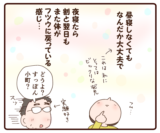 いつもは2,3日、疲れを引きずる感じの時も、寝たらまぁ普通になってる。とか。