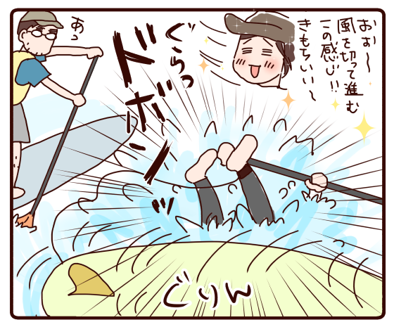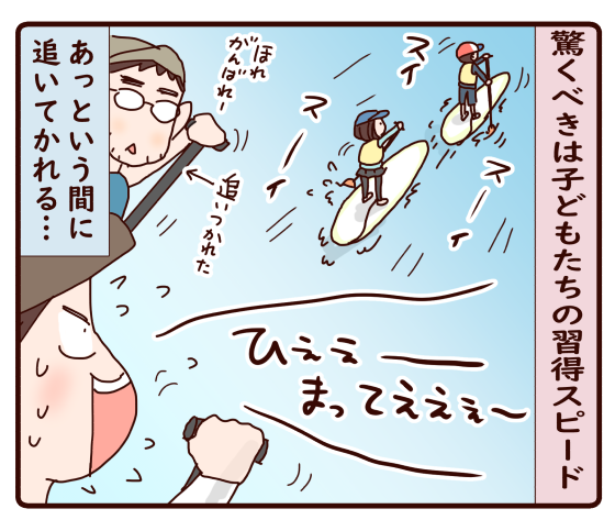 ガイドさんがおっしゃるには子どもは体重が軽い分、ボードがしっかり浮いて安定してる分、進みやすいとか。