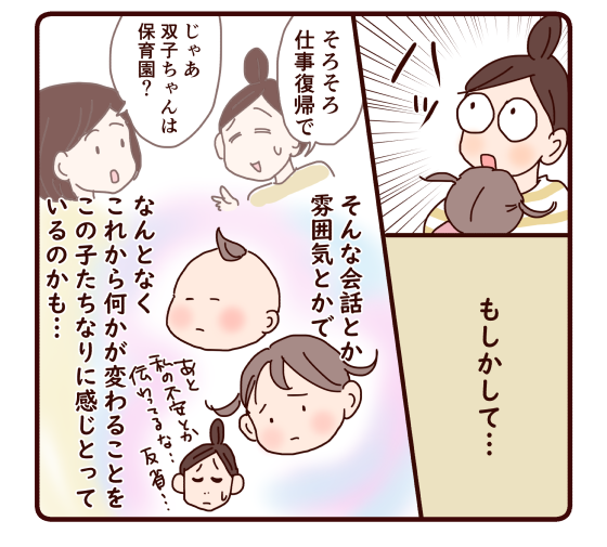 復職前の職場との打ち合わせや、双子との保育園の準備など、だんだん慌ただしくなって、私自身もちゃんと職場でやっていけのるかとか、育児と両立できるのかとか、ついつい自分の不安にばかり目が行ってました。