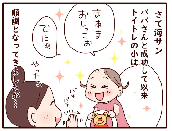 洋はトイレの小も大も、3歳前にはバッチリでしたが、海は小はなんとかトイレでできてきたものの、大はなかなか成功せず…