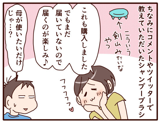 漫画内にも描いたシャンプーブラシ(で合ってる?)ですが、手での洗い残しが多い場合は、これを使ってシャンプーすると洗いやすかったり、汚れも落ちやすかったりするそう。