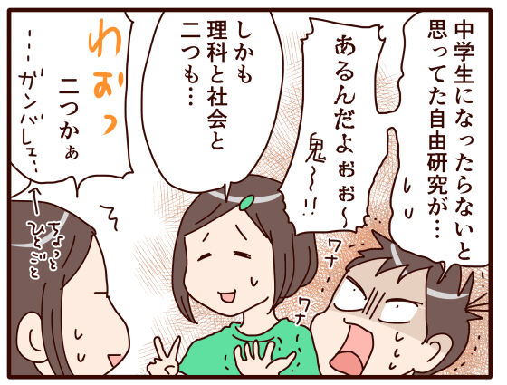 中学生になってから、自由研究があるのかないのか分かりませんが、小学生の時ほど親が手伝う事はなくなりました(家庭科の手芸や料理の宿題は手伝いますが….)