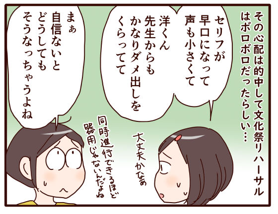 台本が出来上がったのもリハーサルの十日ぐらい前で、ちょうど洋が英語弁論のラストスパートくらいにかかっていて、やつれていたころ。