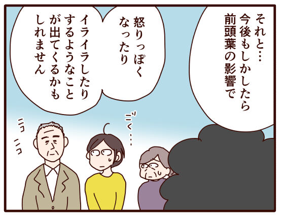 この症状の経過として、今後、前頭葉も委縮してくる可能性が高く、そうなるとイライラや怒りっぽいなど気性が変わってきたり、反社会的な行動がみられるようなことも可能性としてはあるとのこと。