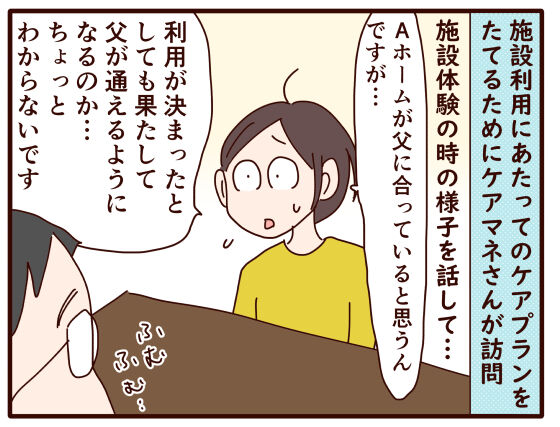 父もそうなる可能性も高いし、そもそもこのケアマネさんが父からの要望を聞くってことが成立しない気もする…