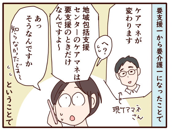 今までのケアマネさんは、包括支援センターの方で、要介護になるともう父にはつけないらしく、別の方を紹介していただきました。