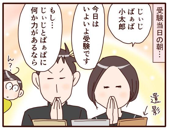 二人は割と落ち着いた様子(洋も夕べのを引きずっていない感じ…?!)で、出かける前にじぃじとばぁばと小太郎の遺影に手を合わせ、最後のお願い(笑)をしていました。