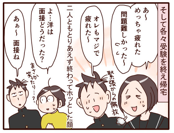 受験を終えての帰宅後は、そんな究極の緊張状態から解放されて、二人ともホッとした顏をしてました。私もそんな二人を見るまでは、ずーっとドキドキと落ち着かずでしたが、とりあえず無事終えたことに安堵。