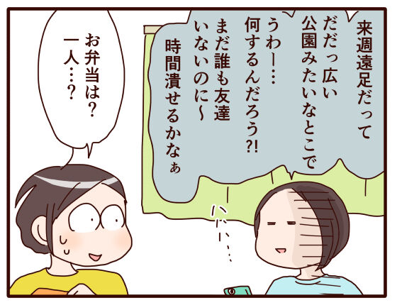 帰りの電車が同じで、途中まで一緒に帰るお友達は一人いるものの(たぶん、遠足のお弁当の希望の光はそのお友達のことと思われます😅)、まだそんなに親しい友達がいない中でのこのイベント。