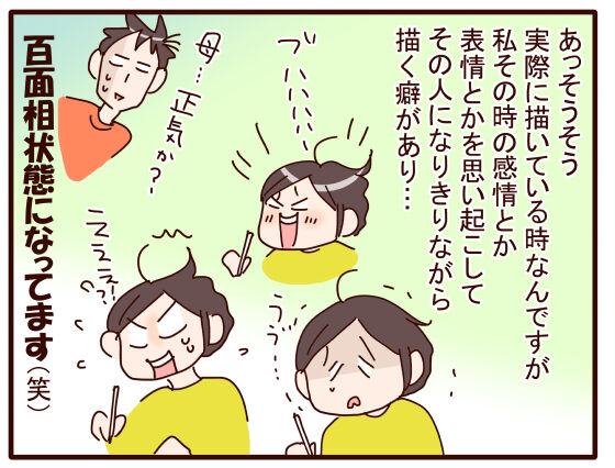 そうそう、私の場合、描いているときはその人になりきってしまっています。表情もシンクロさせて…なので、とても外では描けません(笑)。