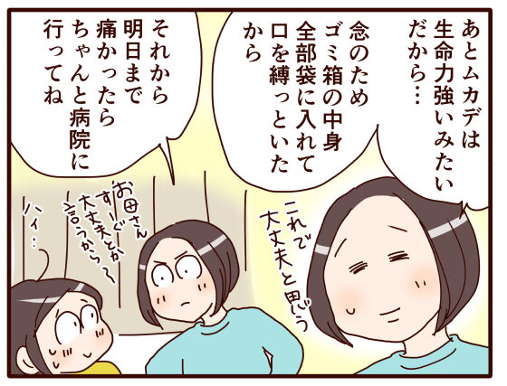 母が戦力外なので、娘の私が冷静にビール瓶やトングで、押さえつけた上でムカデ用殺虫剤を使いトドメを刺していましたよ。