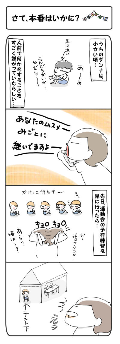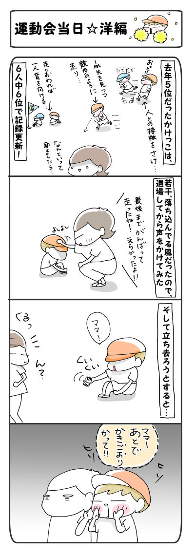 運動会当日☆洋編【4コマ】 2014年10月21日 前記事の海に続く、洋の運動会当日のお話デス。もう4コマという時点で、「ん?」みたいな(笑)。では、本題どぞ~。 ハイ?なんちな?(なんておっしゃった?)いやね、走ってるときはすんごい真剣に走ってたの。そう!チョロQみたいな足の回転!でもいかんせん、スピー ... 続きを読む