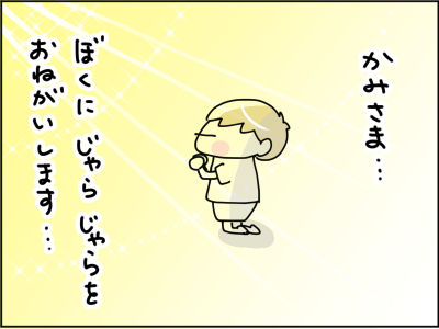 世にも切ない物語 2014年10月28日 これは、少し前のお話。 あるところに、洋という名の4歳ジン(男子)がいました。 洋の言う 『じゃら、じゃら』とは、いったいなんぞや…?その答えは、イ〇ンなどのゲームコーナーにあるコインを使う小さいゲーム機から出る『コインの音』のことである。これまでお金入 ... 続きを読む