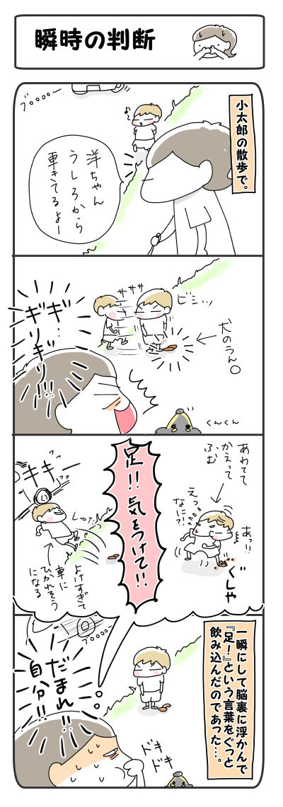 瞬時の判断【4コマ】 2014年11月04日 母は、毎日、「もし、子どもが〇〇したら…」とか、「こうしたらきっと〇〇するであろう」とか、いろいろ考えながら育児しているうちに、瞬時の判断も、ビシバシ鍛え抜かれていくのである。そんな本題、どぞ♪踏んな、踏んな、踏んなよぉーー!!!(踏むなよ)ちなみに今回 ... 続きを読む