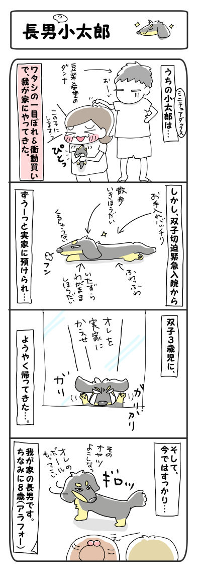 長男?小太郎【4コマ】 2014年10月04日 さて、本日は、我が家のもう一人(1ぴき)の家族についての紹介デス。 兄さんッ、たくましいっス!!我が家の家族の一員、小太郎は、約8年前、我が家にやってきました!ワタシが双子妊娠26週で、切迫のため突然の入院宣告。もう家に帰ることも許されず、やむなく実家お ... 続きを読む