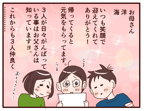 単身先に帰っていく父からの手紙は… 2022年12月02日 ようこそおじゃったもんせ♪読みに来てくださってありがとうございます(*´▽`*)登場人物母 かよポン(作者)基本めんどくさがり。天然ボケ発言多し。ワールドカップで寝不足なアラフィフ母。父 父ポン普段は家族を優しく包むが、母の天然ボケ発言には容赦ない。ただいま ... 続きを読む