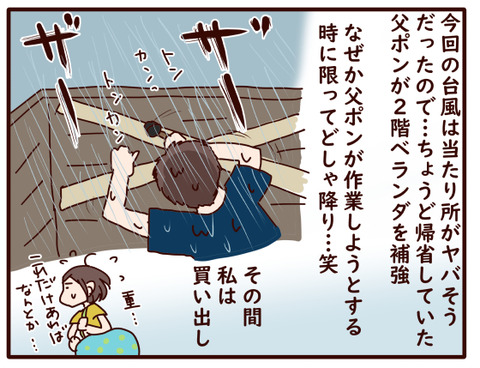 台風の怖さを乗り切ったのは… 2022年09月20日 ようこそおじゃったもんせ♪読みに来てくださってありがとうございます(*´▽`*)登場人物母 かよポン(作者)基本めんどくさがり。天然ボケ発言多し。小学生の頃台風の目に入った瞬間に外に出てみたアラフィフ主婦。父 父ポン普段は家族を優しく包むが、母の天然ボケ発言 ... 続きを読む