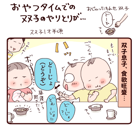 おやつタイムでの双子のやりとりが…(双子1歳半ごろ) 2021年07月14日 ○●○●○●○●○○●○●○●○●ようこそおじゃったもんせ(。・ω・)ノ゙かよポンと申します。海と山に囲まれた田舎暮らし。父は単身赴任中。小学6年生双子の海(女子)と洋(男子)との日々のアレコレ。家族紹介はコチラから→『はじめに』○●○●○●○●○○●○●○●○●双 ... 続きを読む