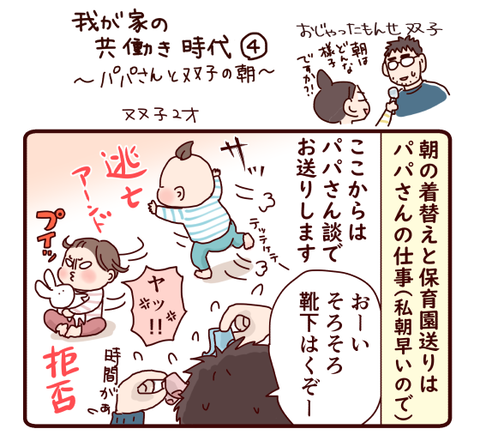 我が家の共働き時代④ ~パパさんと双子の朝~【双子2歳頃】 2021年12月28日 ○●○●○●○●○○●○●○●○●かよポンと申します。海と山に囲まれた田舎暮らし。父のふーさんは単身赴任中。小学6年生双子、海(女子)と洋(男子)のとの日々のアレコレ。家族紹介はコチラから→『はじめに』○●○●○●○●○○●○●○●○●双子乳幼児期のお話デス。 ... 続きを読む
